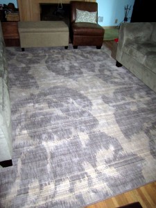 I ended up finding a rug that was being discontinued at a home center here in Minneapolis. That was good news because it was the right size, right color scheme and right price. I knew I wanted something with a slight pattern but more neutral. When I saw it on the display I thought it looked more Ikat-y. But looking at a photo later realized it was more floral-y.
