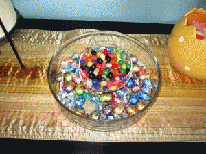 And what’s Easter without candy of course? I put jelly beans in a fruit/dessert cup and put that in a large glass bowl with chocolate candy surrounding it.