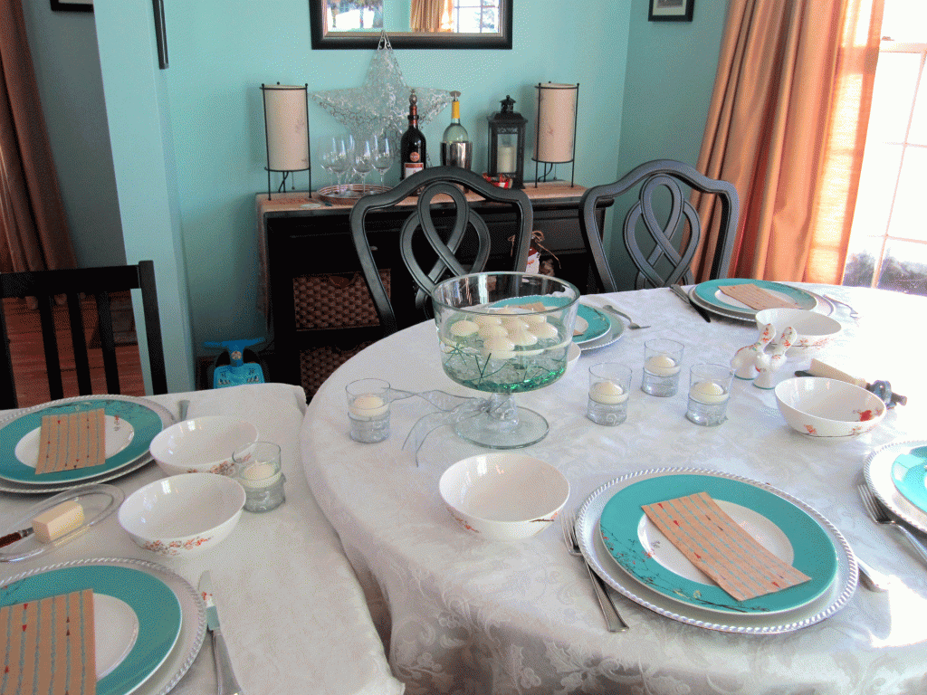 I added water to those and put a candle in each one. Then I set it in the “middle” of the table (we had a card table to seat a few extras).