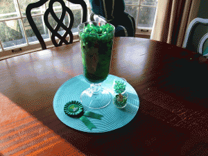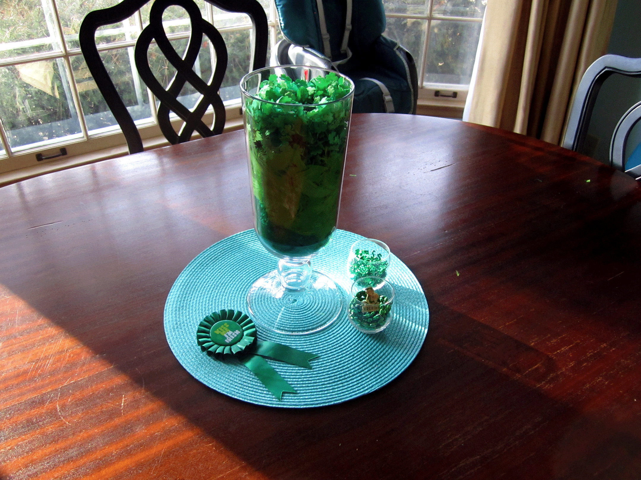 I kept it that way for a couple days. But when I ran into Michael’s for something else, sparkly shamrocks and green hats called out to me, “Lisa, please buy us!” I answered the call with some green of my own and they were mine.